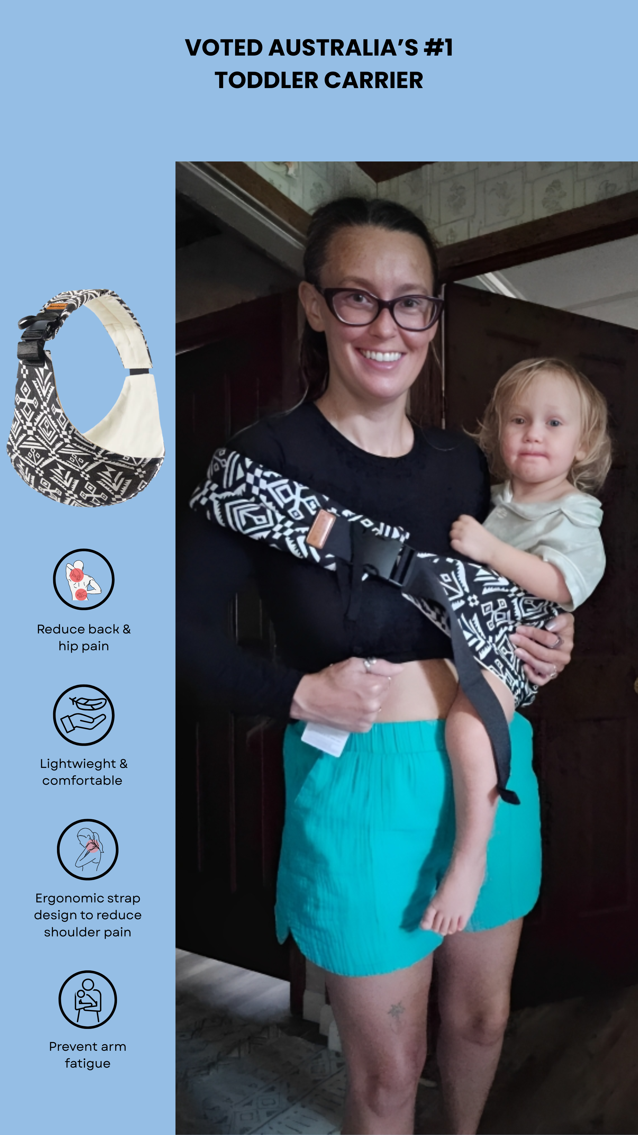 “I used to dread carrying my little one around, but SnugglyBubz made life so much easier. It’s light, comfy, and my toddler actually enjoys being in it. No more sore arms or back pain, I love it!” -